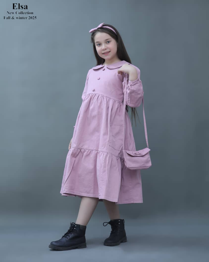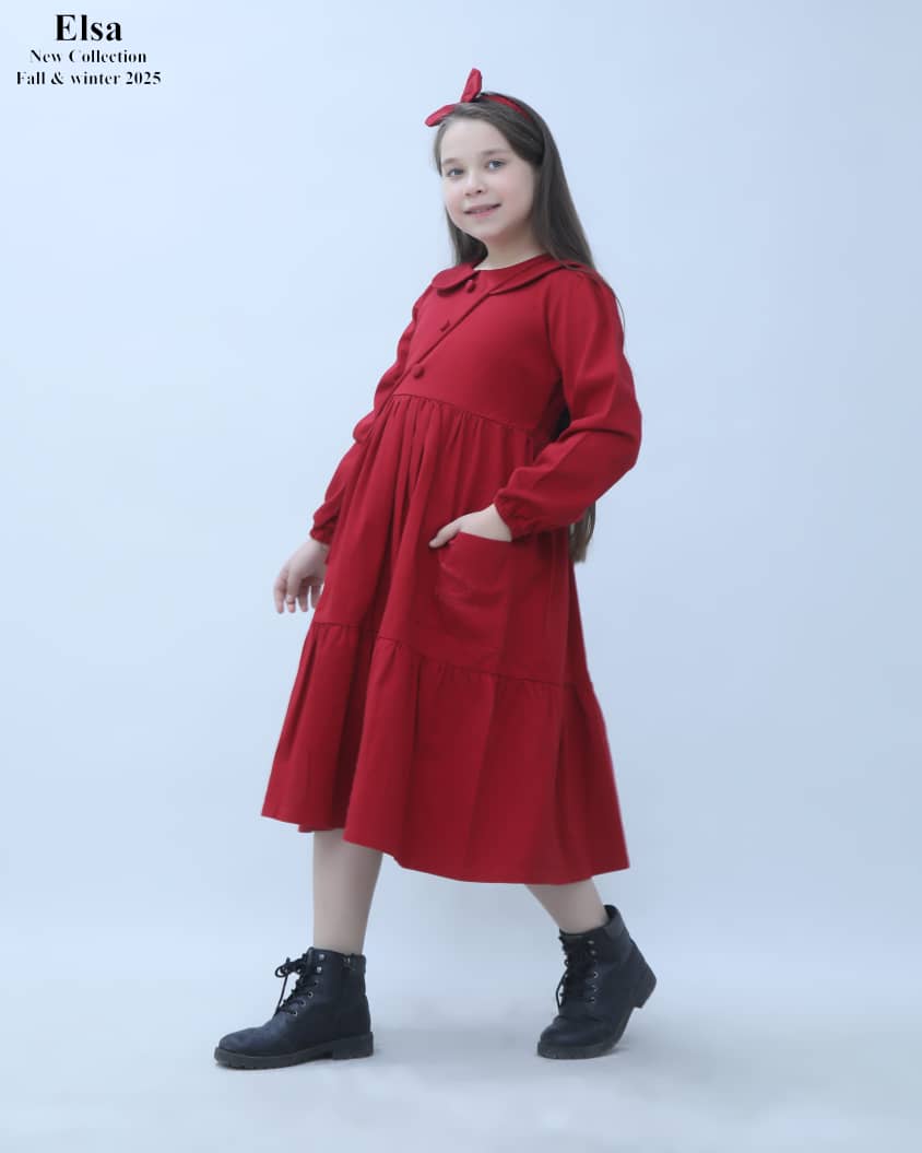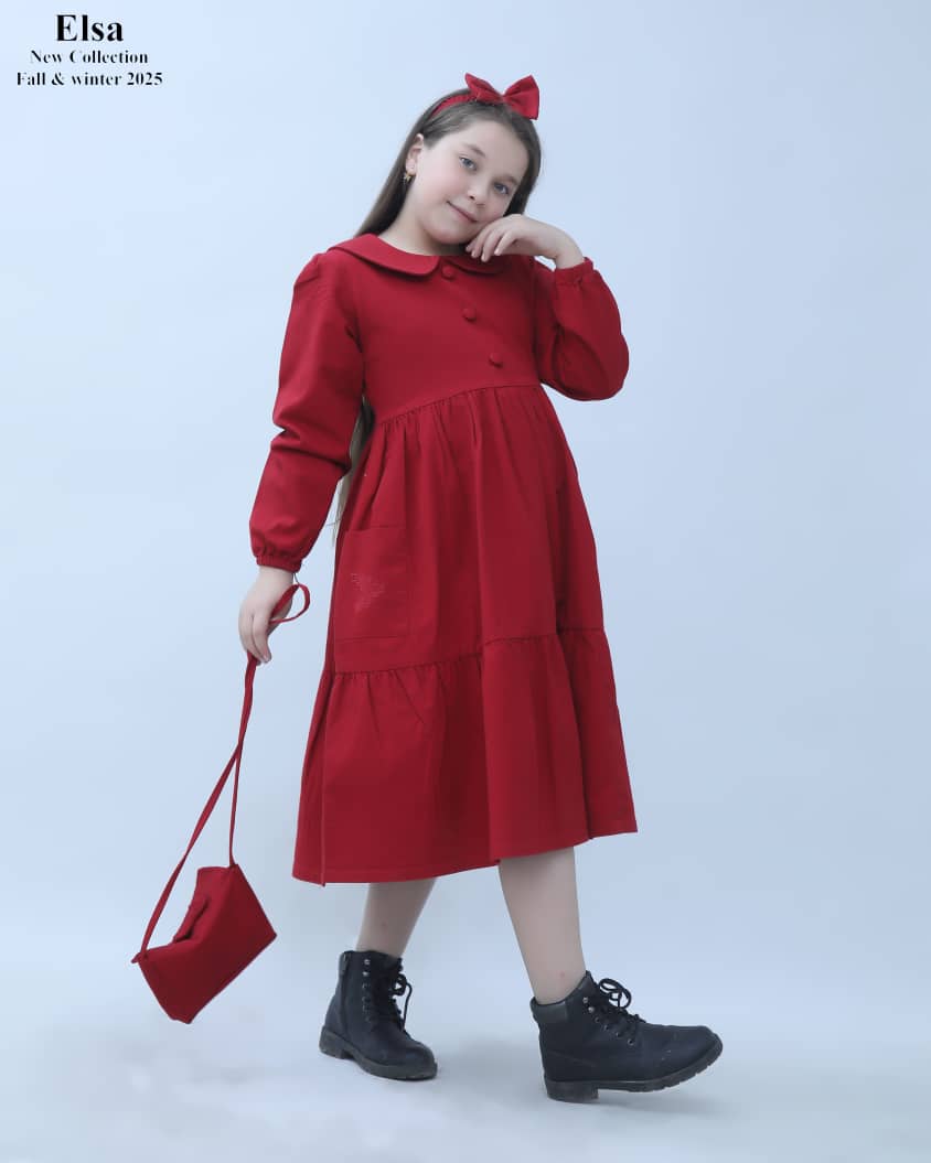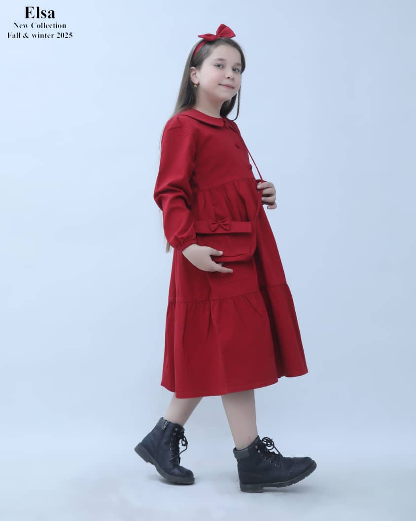 پیراهن دخترانه قرمز صورتی یلدایی ۳ تیکه به همراه کیف وتل