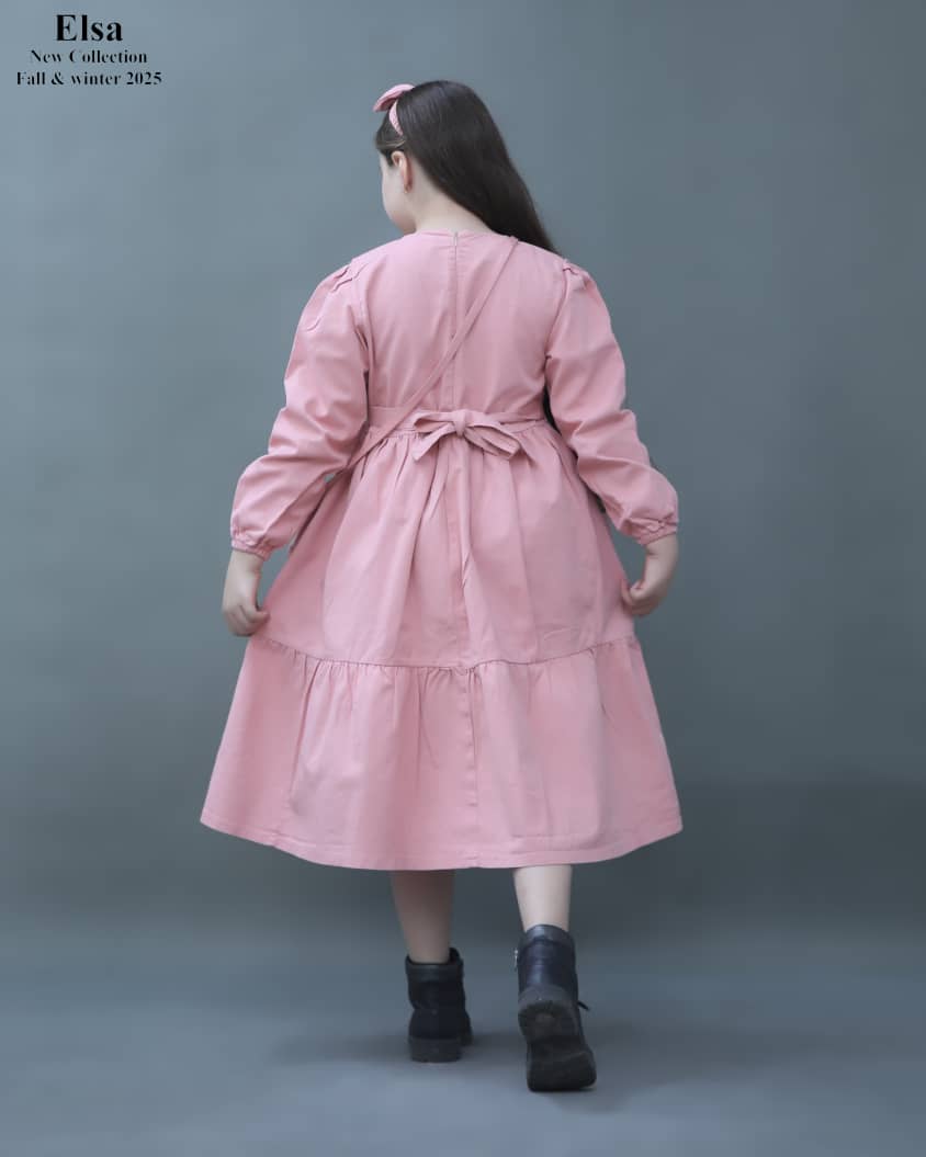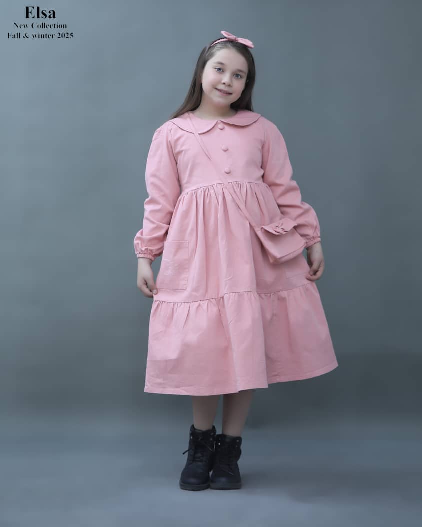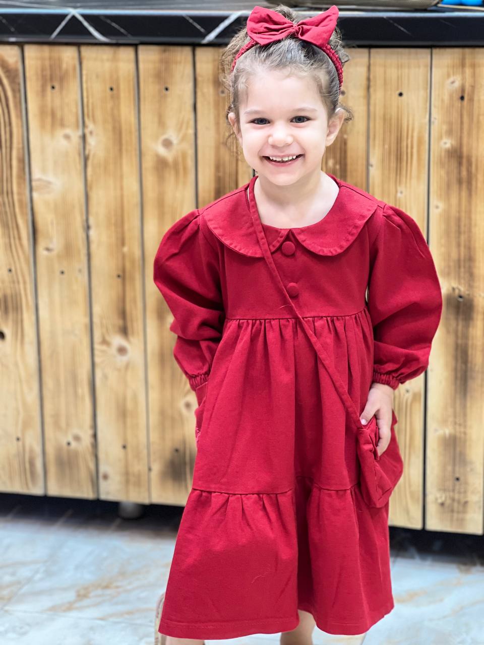 پیراهن دخترانه قرمز صورتی یلدایی ۳ تیکه به همراه کیف وتل