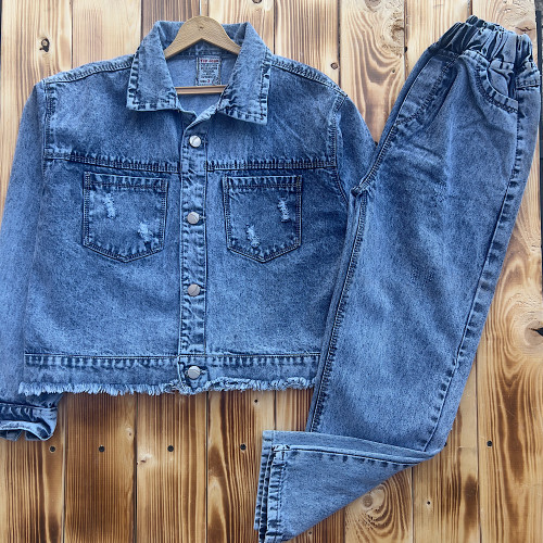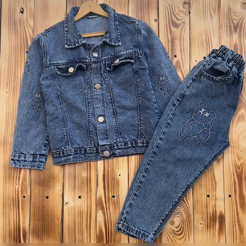 ست کت وشلوار جین آبی پایین ریش دار گلدوزی پروانه